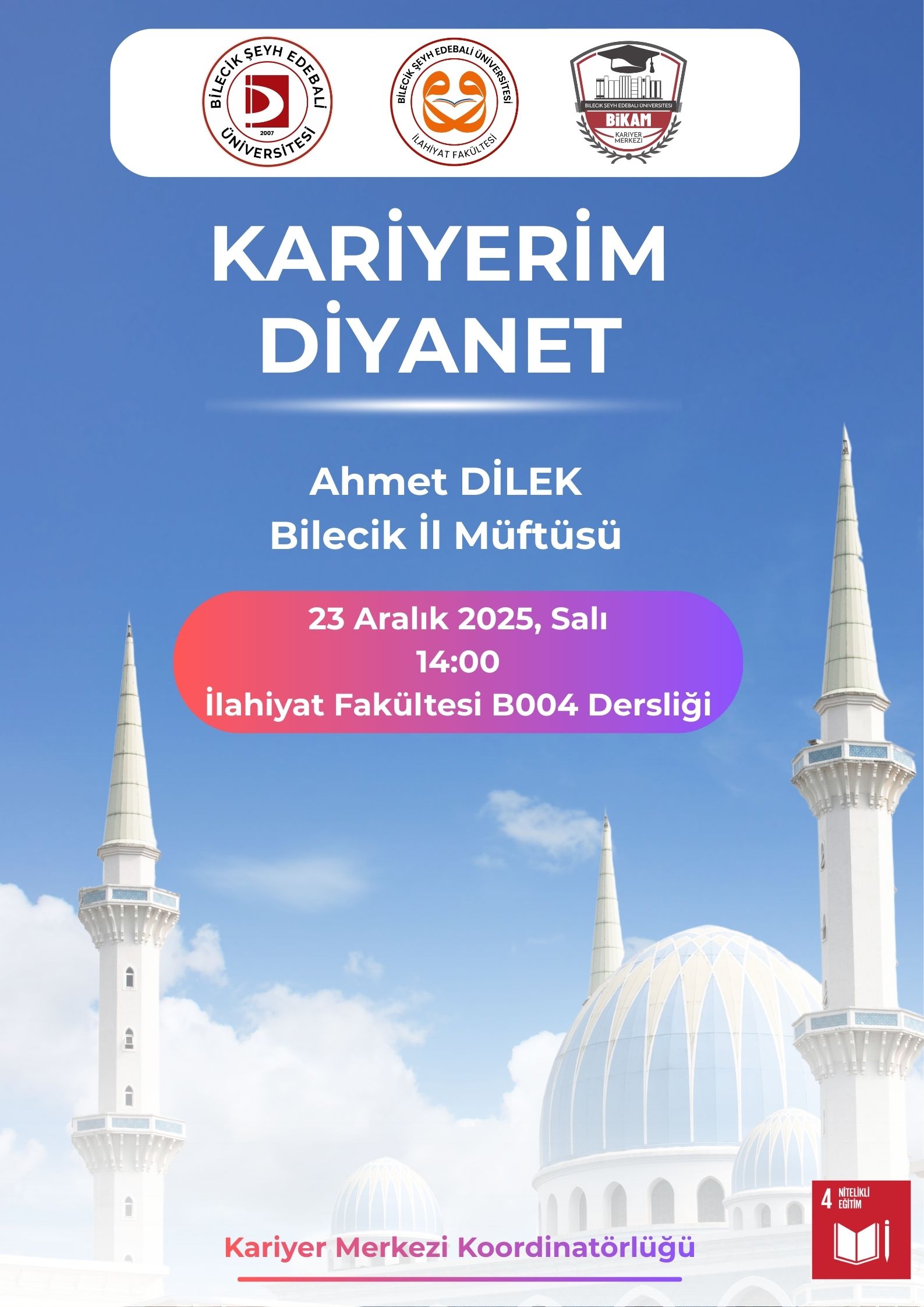 Üniversitemiz Kariyer Merkezi Koordinatörlüğü tarafından düzenlenen “Kariyerim Diyanet” programı kapsamında, Bilecik İl Müftüsü Ahmet DİLEK öğrencilerimizle ve akademik personelimizle bir araya gelecektir.
