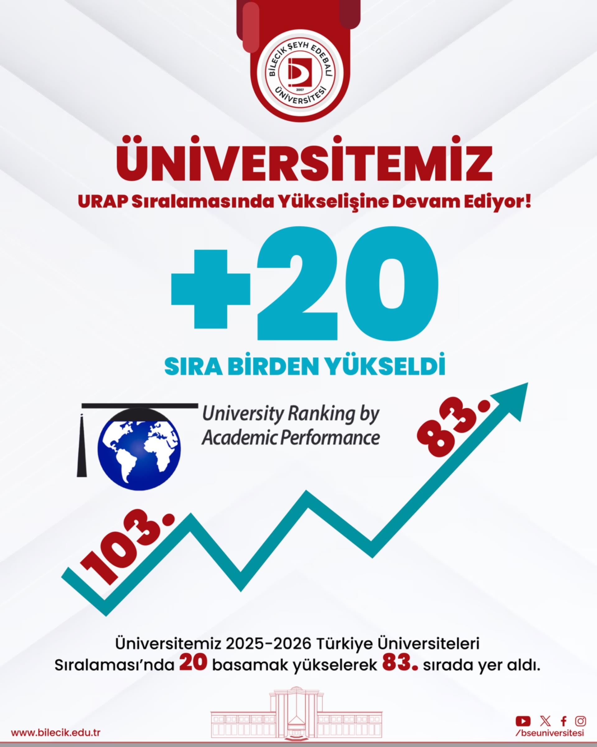 Bilecik Şeyh Edebali Üniversitesi, URAP (University Ranking by Academic Performance) tarafından açıklanan 2025-2026 Türkiye Üniversiteleri Sıralaması’nda 20 basamak yükselerek 83. sırada yer aldı. Üniversitemiz, sıralaması en çok artan üniversiteler arasında gösterildi.