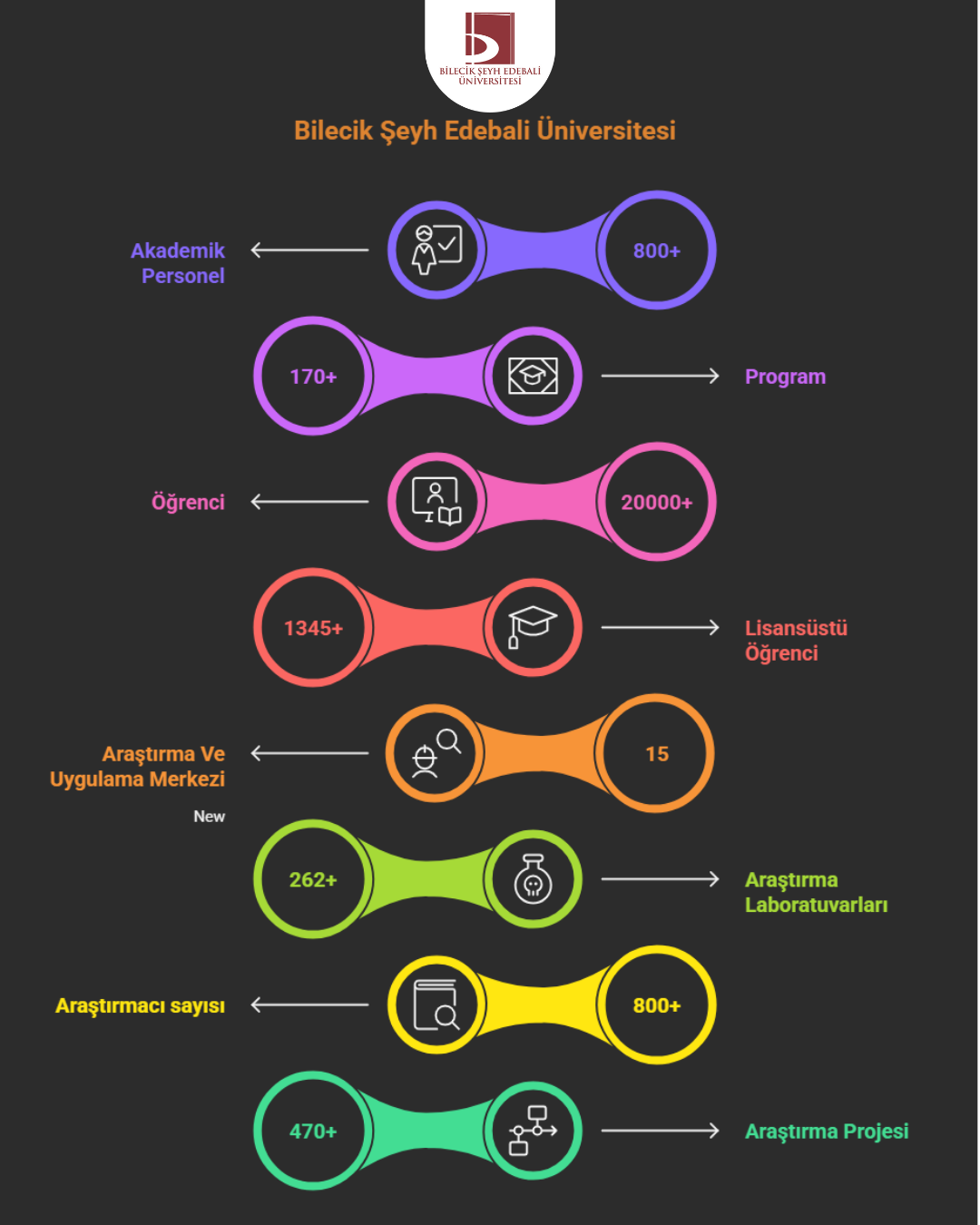 Ülkemizin gelişmekte olan üniversiteleri arasında her geçen gün ismini daha da yukarılara taşımakta olan üniversitemiz 11 fakülte, 1 enstitü, 7 meslek yüksekokulu, 1 yüksekokul, 15 Araştırma ve Uygulama Merkezi, 1 Hastane (Sağlık Bakanlığı ile Bilecik Şeyh Edebali Üniversitesi arasında yapılan afiliasyon anlaşması kapsamında, Tıp Fakültesi akademisyenlerinin ve Bilecik Eğitim ve Araştırma Hastanesi'nin işbirliğini belirtmektedir) ile eğitim-öğretim, bilim, teknoloji ve sanat alanlarında toplumsal kalkınmaya ve evrensel değerlere katkılarını sürdürmektedir.