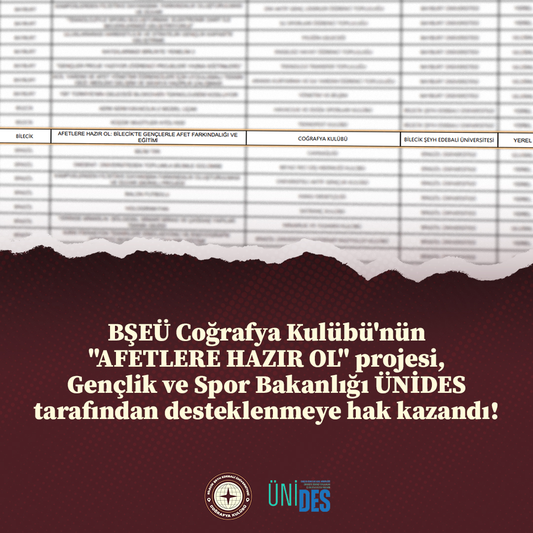 Coğrafya Kulübü'nün "Afetlere Hazır Ol: Bilecik'te Gençlerle Afet Farkındalığı ve Eğitimi" projesi ÜNİDES tarafından desteklenmeye hak kazanmıştır. Kulüp danışman hocamız Dr. Öğr. Üyesi Arda BAY'ı ve değerli öğrencilerimizi tebrik ederiz.