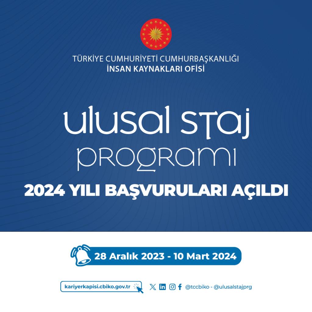 Cumhurbaşkanlığı İnsan Kaynakları Ofisi tarafından koordine edilen Ulusal Staj Programı (USP) başvuruları 2024 yılı için başlamıştır. Bu kapsamda, Üniversitemiz Senatosunda alınan Ulusal Staj Programı Uygulama İlkelerine ilişkin 03.01.2024 tarihli ve 419/1 sayılı karar, Ulusal Staj Programı sürecinde kullanılacak matbu evraklar, sıkça sorulan sorular kılavuzu ve görseller için tıklayınız.