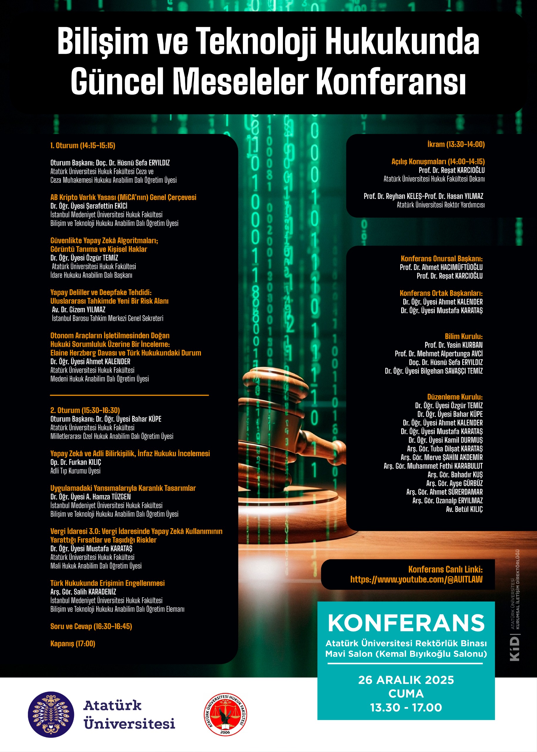 Atatürk Üniversitesi Hukuk Fakültesi tarafından, 26 Aralık 2025 Cuma günü Rektörlük Binası Mavi salonunda (Kemal Bıyıkoğlu Salonu) düzenlenecek olan "Bilişim ve Teknoloji Hukukunda Güncel Meseleler Konferansı" ile ilgili afiş ektedir.