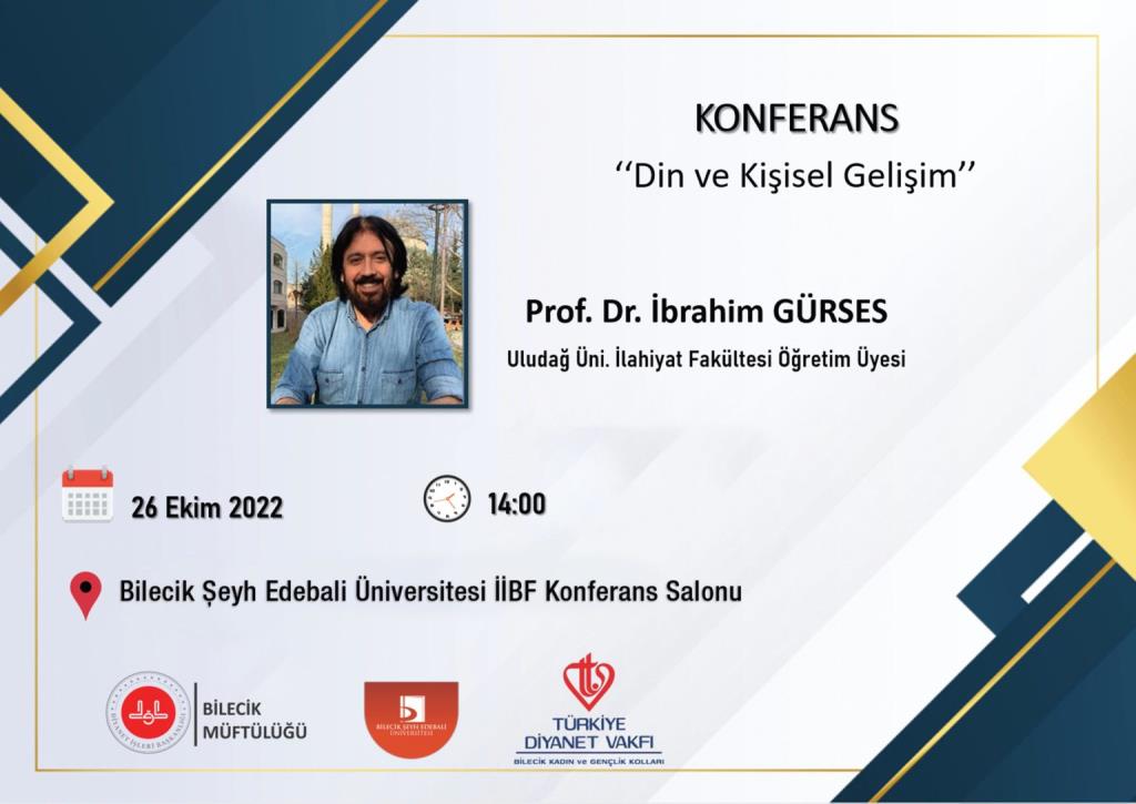 Bilecik Şeyh Edebali Üniversitesi (BŞEÜ) ve Bilecik İl Müftülüğü işbirliği ile üniversite öğrencilerine yönelik “Din ve Kişisel Gelişim” konulu konferans düzenlenecek olup konuşmacı olarak Uludağ Üniversitesi İlahiyat Fakültesi Öğretim Üyesi Prof. Dr. İbrahim GÜRSES katılacaktır. Konferansa tüm personel ve öğrencilerimiz davetlidir.