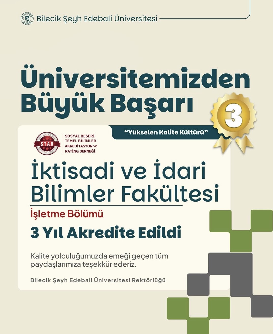 Our Department of Business Administration has been accredited for three years, effective March 2026, by the Social Humanities and Basic Sciences Accreditation and Rating Association, known as "STAR". We extend our gratitude to all those involved in this process and hope that this evaluation will be beneficial for all our endeavors.