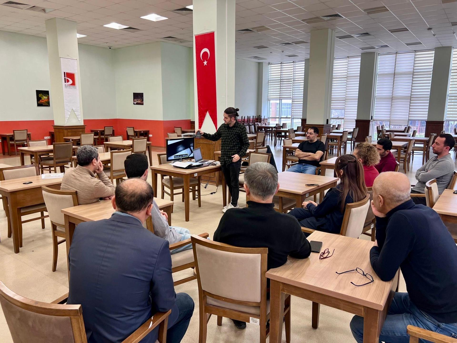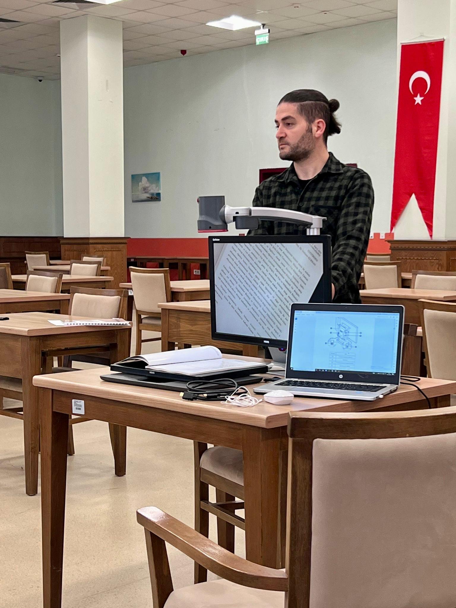 Kütüphane ve Dokümantasyon Daire Başkanlığı personelinin katılımıyla gerçekleştirilen uygulamalı eğitimde, cihazın öğrencilere nasıl etkin destek sağlayabileceği örneklerle gösterildi.