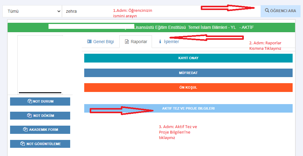 Cevap: Ders aşamasında olduğu gibi tez aşamasında da ders seçimi işlemi yapılmalıdır. Tez aşamasına geçen öğrenciler Tez Çalışması ve Uzmanlık Alan derslerini seçerek kayıt yaptırırlar. Ayrıca eğer öğrenci ders aşamasında alınmadıysa veya geçemediyse Bilim Etiği ve Araştırma Teknikleri dersini tez aşamasında alabilir.