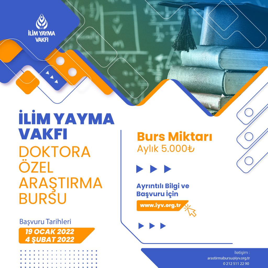 İlim Yayma Vakfı, ülkemizin stratejik amaçlarına katkıda bulunacak sosyal bilimler ile mühendislik, doğa ve sağlık bilimlerinden farklı ihtisas alanlarında doktora çalışmalarını yürüten başarılı araştırmacılara “Doktora Özel Araştırma Bursu” verecektir. Doktora eğitimini Türkiye’deki üniversitelerde sürdüren (uluslararası öğrenciler de dahil), yeterlilik aşamasını geçmiş ve doktora tez konusu enstitü tarafından onaylanmış adaylar başvurularını, 4 Şubat 2022 tarihine kadar https://www.iyv.org.tr/tr/doktora-ozel-arastirma-bursu.html adresi üzerinden gerçekleştirebilirler. Şartları sağlayan adaylara, 12 ay süreyle aylık 5.000 TL burs verilecektir.