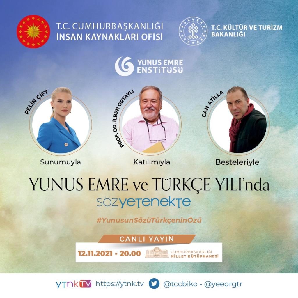 Cumhurbaşkanlığı İnsan Kaynakları Ofisi tarafından düzenlenen "Söz Yetenekte” programı bu kez Pelin Çift, İlber Ortaylı ve Can Atilla’yı Millet Kütüphanesinden yapılacak canlı yayınla sizler ile buluşturuyor. 12 Kasım Cuma günü saat 20:00’deki canlı yayında yapılacak bilgi yarışması ile ödülleri kazanma ve yayını yerinde izleme fırsatı için www.yetenekkapisi.org’daki etkinliğe bugün (11.11.2021) başvurmayı unutma !