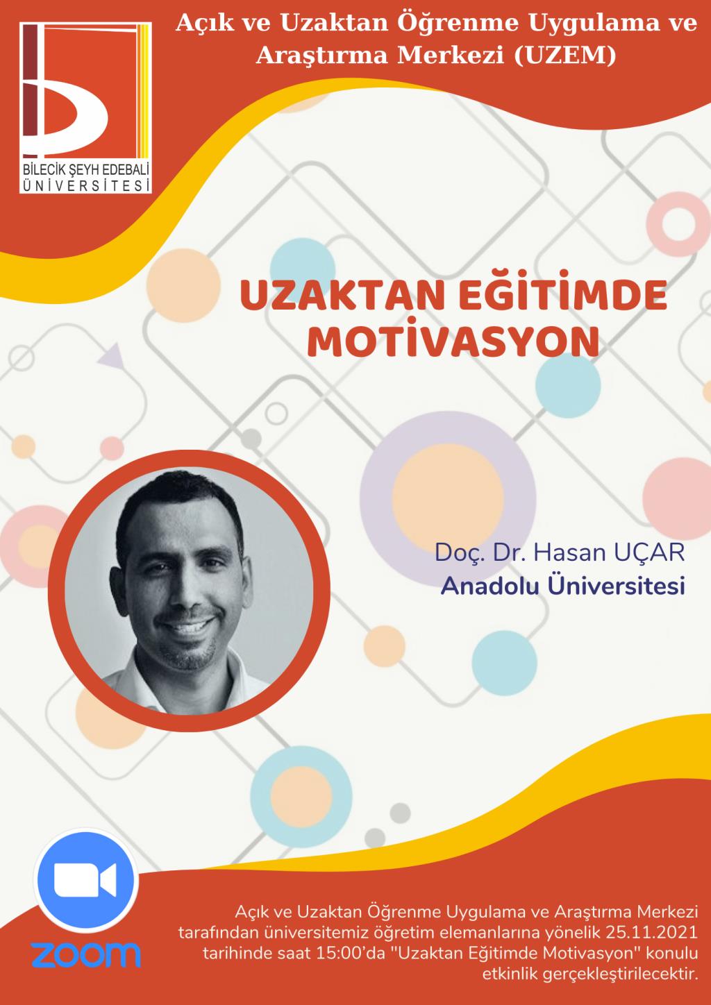 Açık ve Uzaktan Öğrenme Uygulama ve Araştırma Merkezi tarafından üniversitemiz öğretim elemanlarına yönelik 25.11.2021 tarihinde saat 15.00'de "Uzaktan Eğitimde Motivasyon" konulu etkinlik Zoom platformu üzerinden gerçekleştirilecektir. Etkinlik asenkron olarak uzaktan eğitim sistemi (ders.bilecik.edu.tr) üzerinden de izlenebilecektir. Etkinlik linki akademik birimlere yazı ile iletilmiştir.