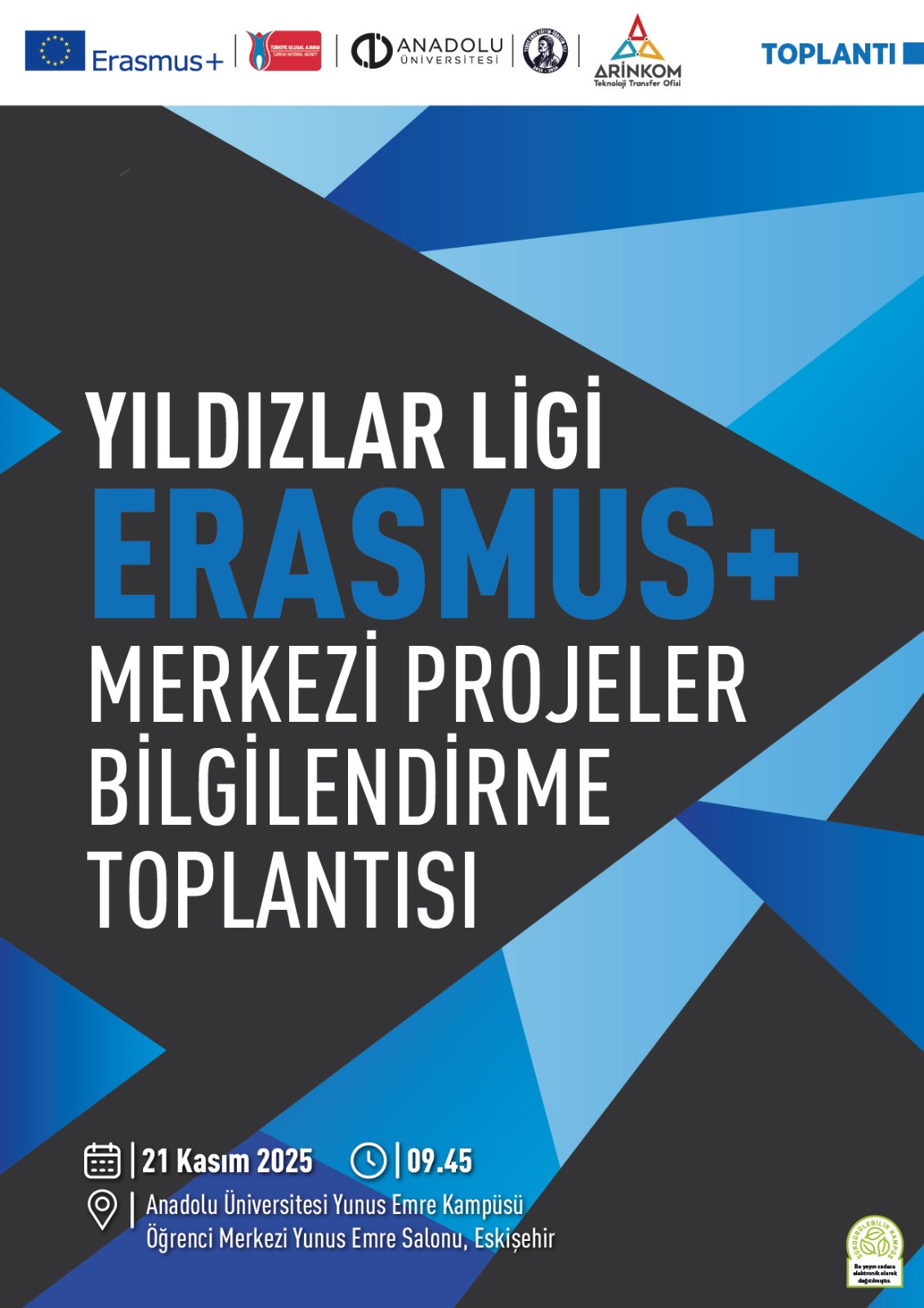 Anadolu Üniversitesi ev sahipliğinde, Türkiye Ulusal Ajansı iş birliğiyle düzenlenecek “Yıldızlar Ligi Erasmus+ Merkezi Projeler Bilgilendirme Toplantısı” 21 Kasım 2025, Cuma günü saat 09.45'te Anadolu Üniversitesi Yunus Emre Kampüsü Öğrenci Merkezi Yunus Emre Salonunda gerçekleşecektir. Toplantıda Erasmus+ programının merkezi projelerine ilişkin politika öncelikleri, teknik bilgiler, örnek projeler ve başarılı uygulamaları ele alınacaktır. Toplantı ile ilgili ankete https://l24.im/lua2Ohj adresinden katılabilirsiniz.