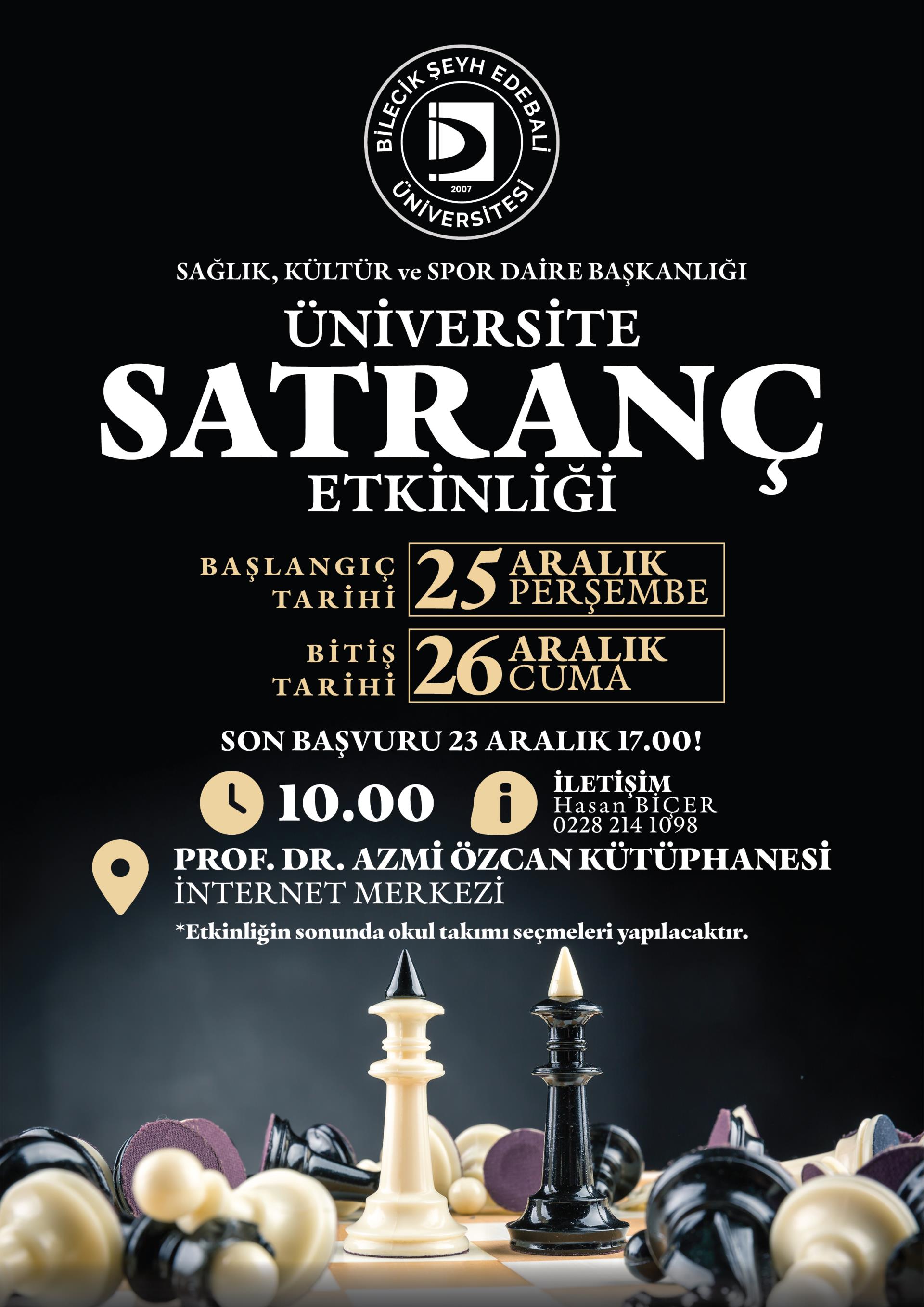Üniversitemizde 25-26 Aralık 2025 tarihlerinde Prof. Dr. Azmi ÖZCAN Kütüphanesinde Satranç Turnuvası düzenlenecek olup, başvurular online olarak alınacak ve 23 Aralık 2025 tarihinde sona erecektir.
