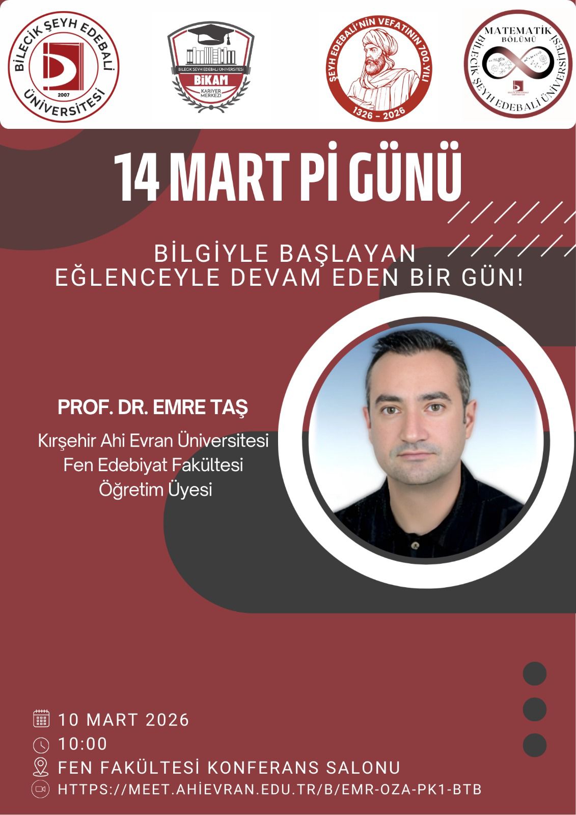 Bölümümüz tarafından düzenlenen Pi Günü etkinlikleri kapsamında öğrencilerimizle birlikte eğlenceli ve öğretici bir gün geçirmeye hazırlanıyoruz.