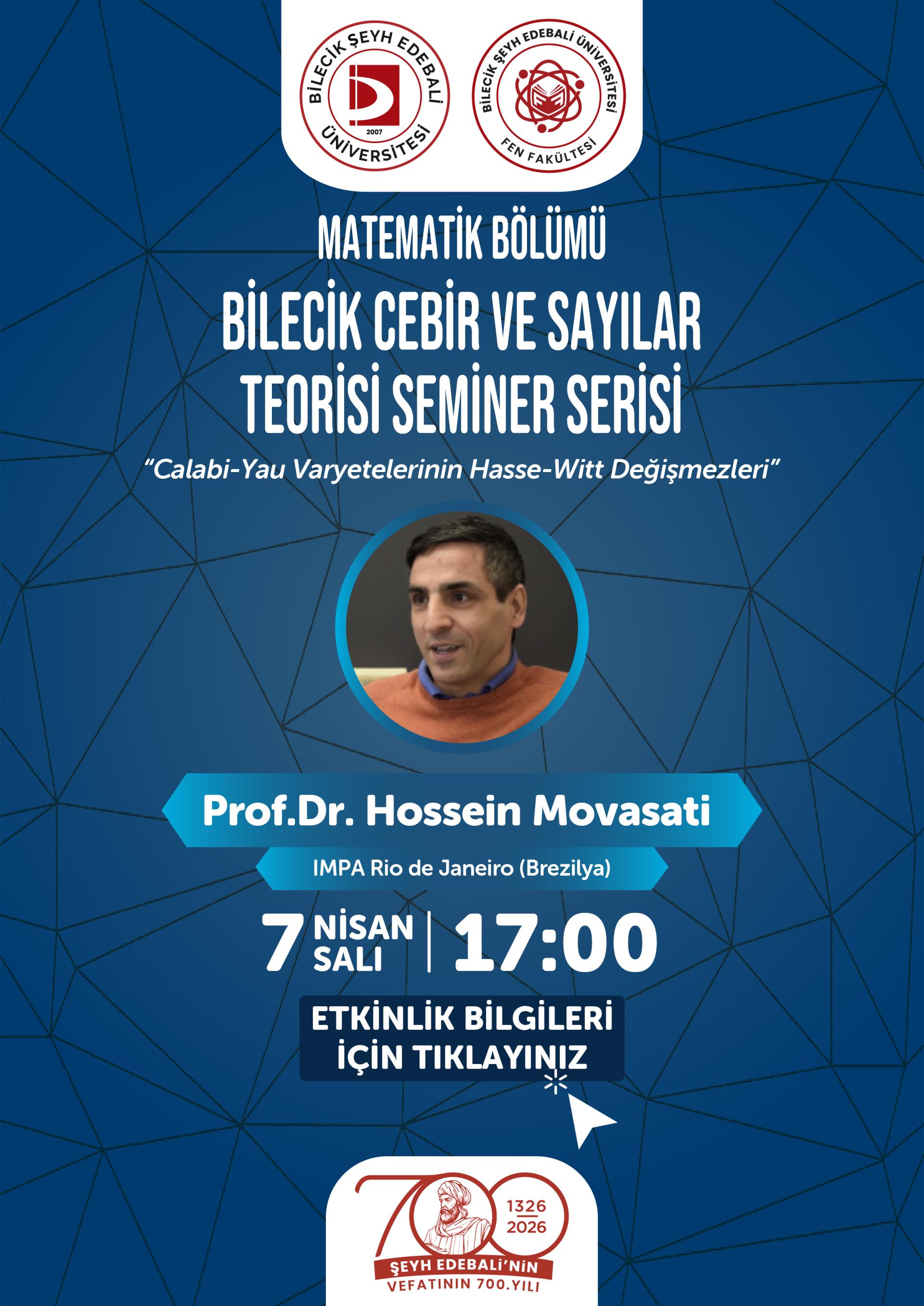 Cebir ve Sayılar Teorisi Anabilim Dalı Öğretim Üyeleri tarafından 2025 - 2026 Eğitim Öğretim Yılı Bahar Yarıyılında çevrim içi olarak düzenlenmeye devam eden genel seminerlerin yeni konuşması 7 Nisan 2026 tarihinde IMPA-Brasil Öğretim Üyesi Prof. Dr. Hossein Movasati tarafından verilecektir. Detaylı bilgilere https://bilecikalgebranumbertheory.github.io/ adresinden ulaşılabilir.