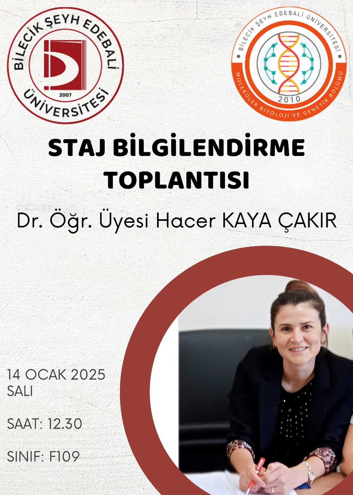 Staj ile alakalı ihtiyacınız olan tüm bilgileri öğreneceğiniz, merak ettiğiniz sorularınızı sorabileceğiniz, bölümümüzün öğretim üylerinden Dr. Öğr. Üyesi Hacer KAYA ÇAKIR ile gerçekleştireceğimiz staj bilgilendirme toplantımıza ilgili bütün öğrencilerimiz davetlidir.