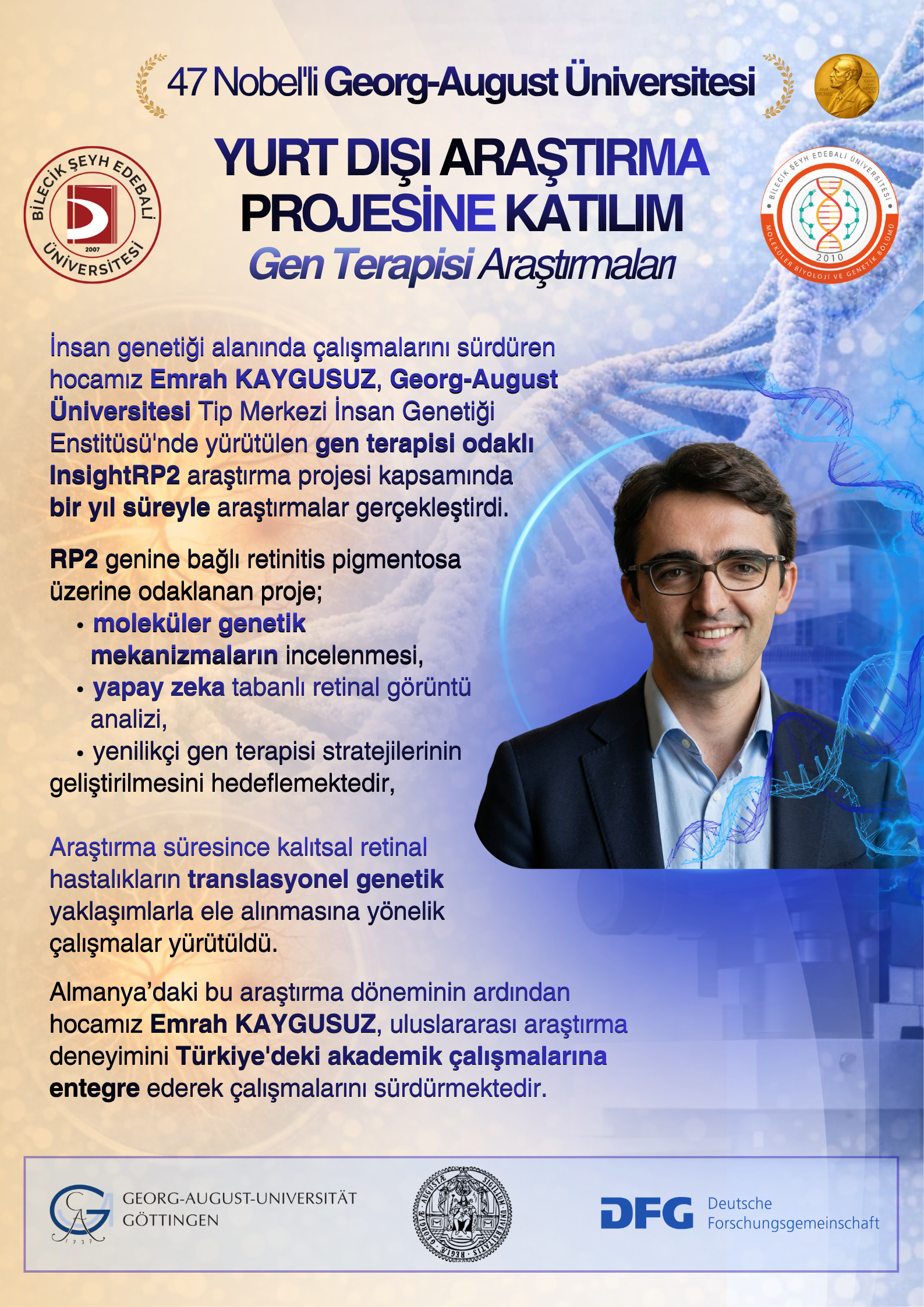 Bilecik Şeyh Edebali Üniversitesi Moleküler Biyoloji ve Genetik Bölümü öğretim üyelerinden Dr. Öğr. Üyesi Emrah KAYGUSUZ, yetiştirdiği Nobel ödüllü bilim insanlarıyla dünya biliminde önemli bir yere sahip olan Georg-August Üniversitesi’nde yürütülen uluslararası bir araştırma projesine katılım sağlamıştır.