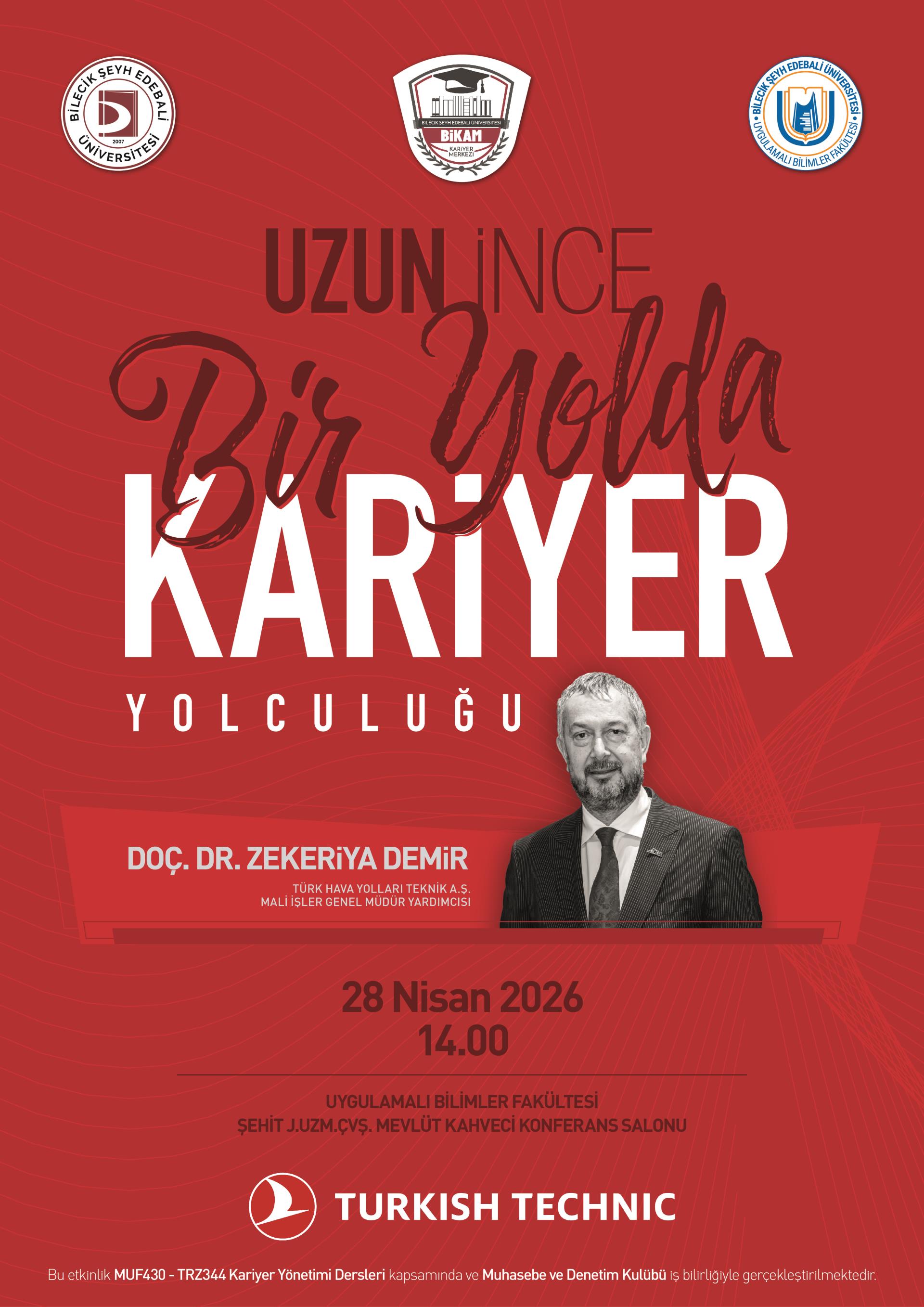 28 Nisan 2026 Salı günü Saat 14.00'te Uygulamalı Bilimler Fakültesi Şehit J.Uzm. Çvş. Mevlüt KAHVECİ Konferans Salonu'nda Fakülteniz öğrencilerine kariyer yolculuğu hakkında bilgi vermek amacıyla Türk Hava Yolları Teknik A.Ş. Mali İşler Genel Müdür Yardımcısı Doç. Dr. Zekeriya DEMİR'in katılımıyla gerçekleştireceği "Uzun İnce Bir Yolda Kariyer Yolculuğu" adlı etkinlik gerçekleştirilecektir.