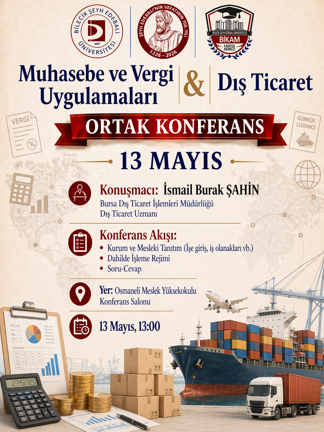 13 Mayıs Çarşamba günü saat 13.00’te, Ticaret Bakanlığı Bursa Dış Ticaret İşlemleri Müdürlüğü’nde dış ticaret uzmanı olarak görev yapan Sayın İsmail Burak ŞAHİN’in konuşmacı olarak katılımıyla bir konferans gerçekleştirilecektir. Etkinlik kapsamında ilgili kurum ve mesleğe ilişkin tanıtıcı bilgilere yer verilecek, ayrıca katılımcıların sorularının cevaplandırılacağı bir soru-cevap bölümü de düzenlenecektir. Etkinliğimize ilgi duyan ve ilgi duyabileceğini düşündüğünüz herkesi Osmaneli Meslek Yüksekokulu Konferans Salonu’na bekliyoruz.