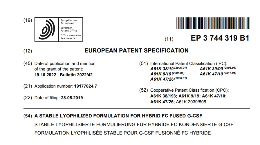 Bölümümüz öğretim üyelerinden Dr. Ecz. Adem Şahin'in inventorleri arasında yer aldığı "A stable lyophilized formulation for hybrid fc fused g-csf" isimli patent Avrupa Patent Ofisi tarafından tescil edilmiştir.