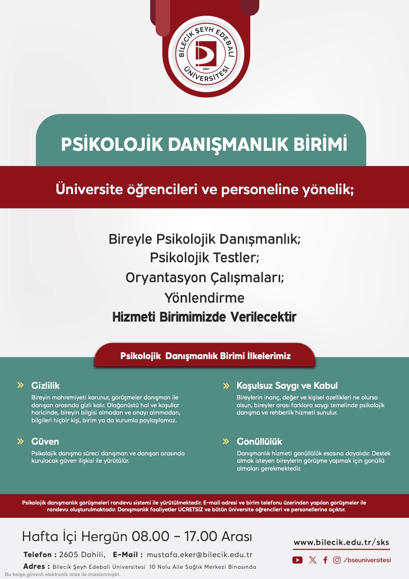 Üniversitemiz Sağlık, Kültür ve Spor Daire Başkanlığı bünyesinde faaliyet gösteren Psikolojik Danışmanlık Birimi, akademik ve idari personelimiz ile öğrencilerimize ücretsiz olarak danışmanlık hizmeti verecek. 10 No’lu Aile Sağlığı Merkezi binasında verilen bu hizmetler; bireylerin günlük hayatta veya akademik süreçlerde karşılaştıkları zorluklarla başa çıkmalarına destek olmayı hedefliyor.