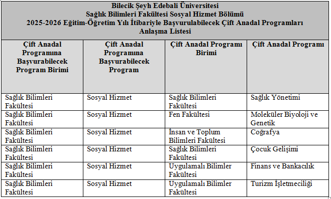 SOSYAL HİZMET BÖLÜMÜ ÇİFT ANADAL PROGRAMLARI