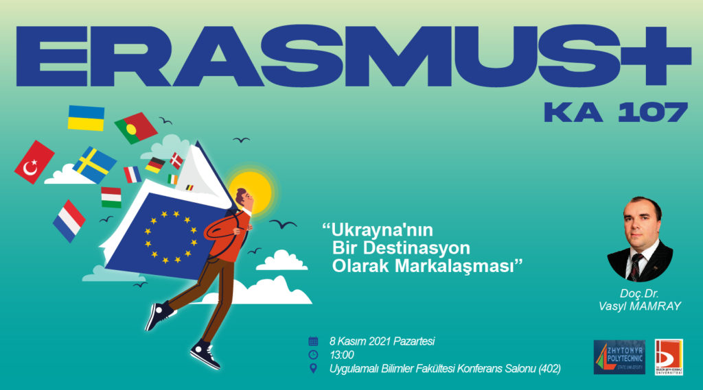 Erasmus+ KA 107 projesi kapsamında Ukrayna Zhytomyr Polytechnic State Üniversitesi ile fakültemiz Turizm İşletmeciliği ve Turizm Rehberliği bölümleri arasında bir anlaşma imzalanmıştır. Bu kapsamda Zhytomyr Polytechnic State Üniversitesi Uluslararası İlişkiler Kurum Koordinatörü Doç. Dr. Vasyl Mamray, 08.11.2021 Pazartesi günü Saat 13:00’da fakültemiz konferans salonunda bir sunum gerçekleştirecektir.