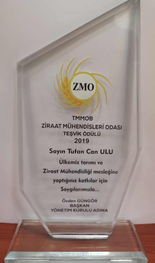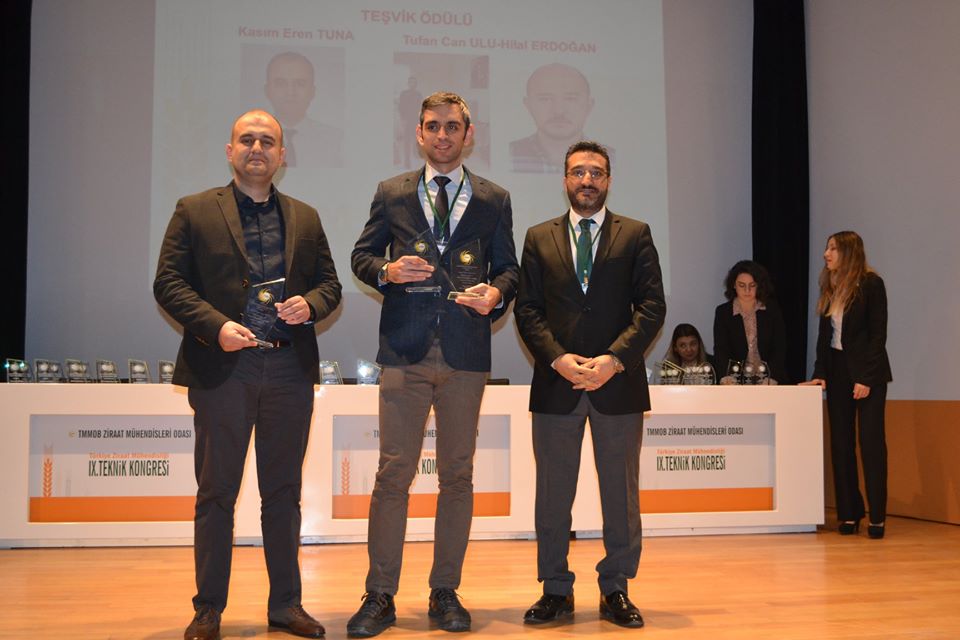 Dr. Öğr. Üyesi Tufan Can ULU ile Bursa Uludağ Üniversitesi Ziraat Fakültesi Biyosistem Mühendisliği Bölümü’nden Arş. Gör. Hilal ERDOĞAN, birlikte yapmış oldukları çalışmalar neticesinde TMMOB Ziraat Mühendisleri Odası tarafından verilen 2019 Yılı Teşvik Ödülü’nü almaya hak kazanmışlardır.