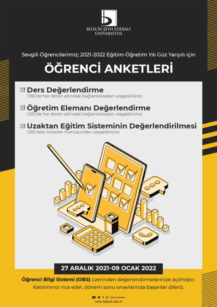 2021-2022 eğitim öğretim yılı güz yarıyılına ait Öğretim Elemanı, Ders ve Uzaktan Eğitimin Değerlendirilmesi Anketleri Öğrenci Bilgi Sisteminde (OBS) 27 Aralık 2021’den başlayarak 9 Ocak 2022 gün sonuna kadar erişilebilecek şekilde öğrencilerimizin değerlendirilmesine açılmıştır.