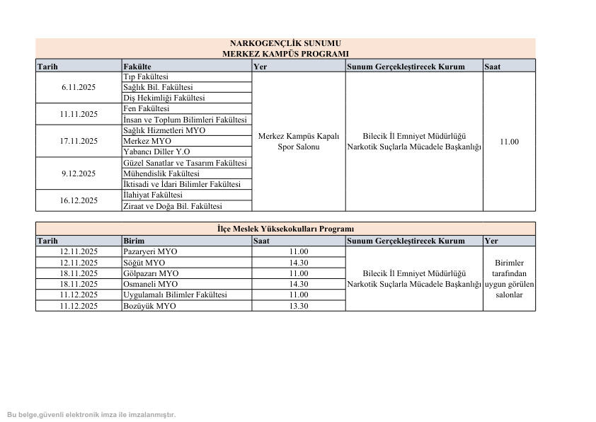 Konu ile ilgili olarak 2025-2026 Öğrenim yılı başlangıcında ve yıl boyunca Bilecik Şeyh Edebali Üniversitesinde öğrenim gören öğrencilerimize NARKOGENÇLİK sunumu yapılması planlanmakta olup sunum programı aşağıdaki gibidir.