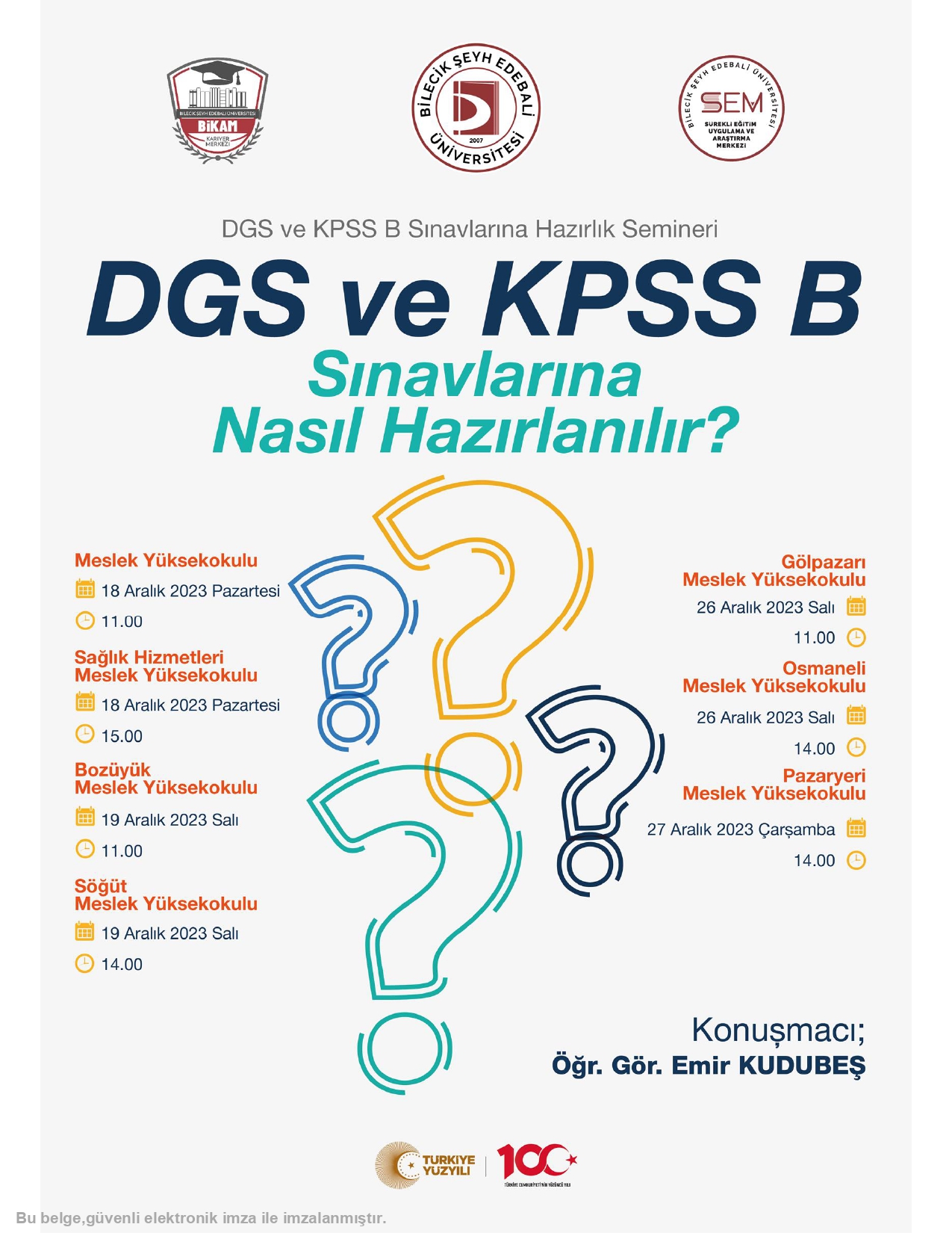 Üniversitemiz Kariyer Merkezi Koordinatörlüğü ile Sürekli Eğitim Uygulama ve Araştırma Merkezi iş birliğiyle Meslek Yüksekokullarımızda ''DGS ve KPSS B Sınavlarına Hazırlık'' seminerleri gerçekleştirilecektir.