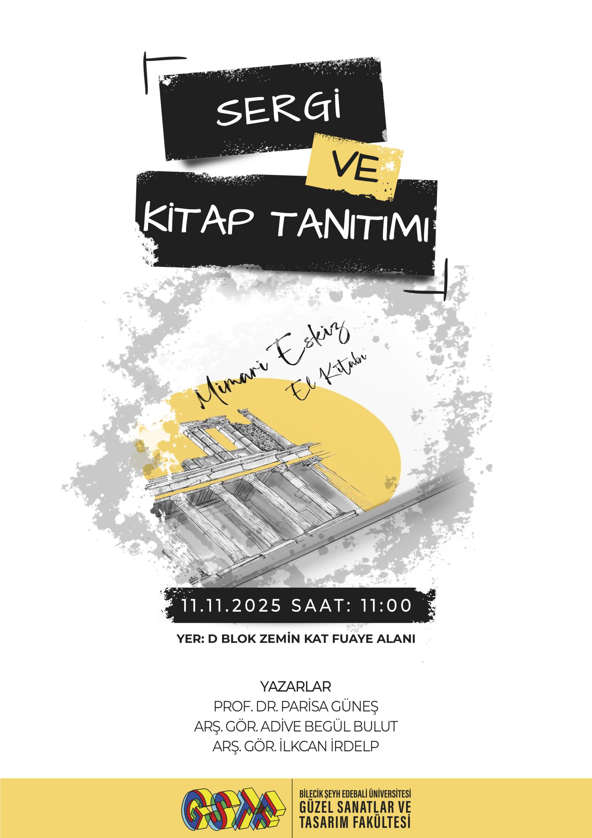 Güzel Sanatlar ve Tasarım Fakültesi, öğretim elemanlarından Prof. Dr. Parisa GÜNEŞ, Arş. Gör. Adive Begül BULUT ve Arş. Gör. İlkcan İRDELP tarafından kaleme alınan "Mimari Eskiz El Kitabı”nın tanıtımı ve kitapta yer alan özgün eserlerin sergisi gerçekleştirilecektir.