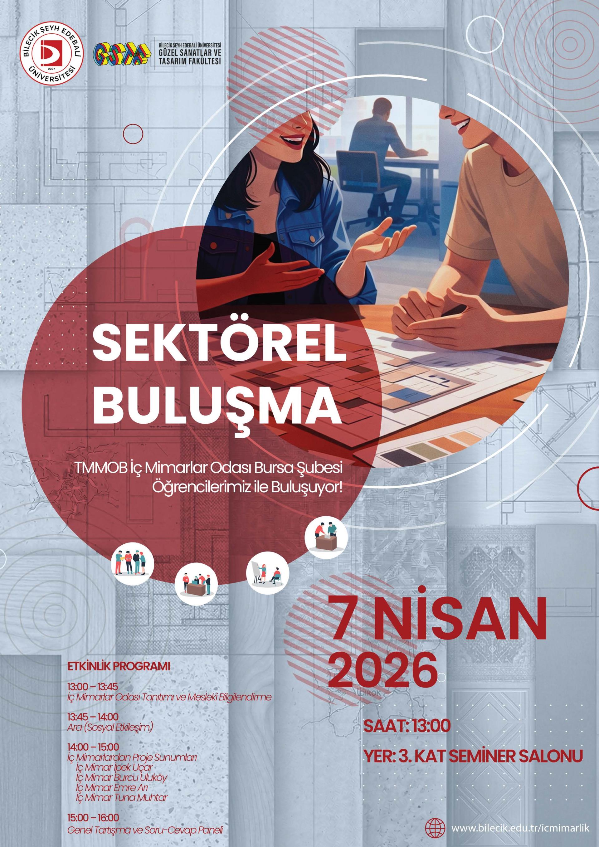 Bölümümüz tarafından düzenlenen ve TMMOB İç Mimarlar Odası Bursa Şubesi’nin davetli olarak katılacağı “Sektörel Buluşma” etkinliği, 7 Nisan 2026 tarihinde saat 13:00’te, 3. Kat Seminer Salonu’nda gerçekleştirilecektir. Katılımınızdan memnuniyet duyulacaktır.