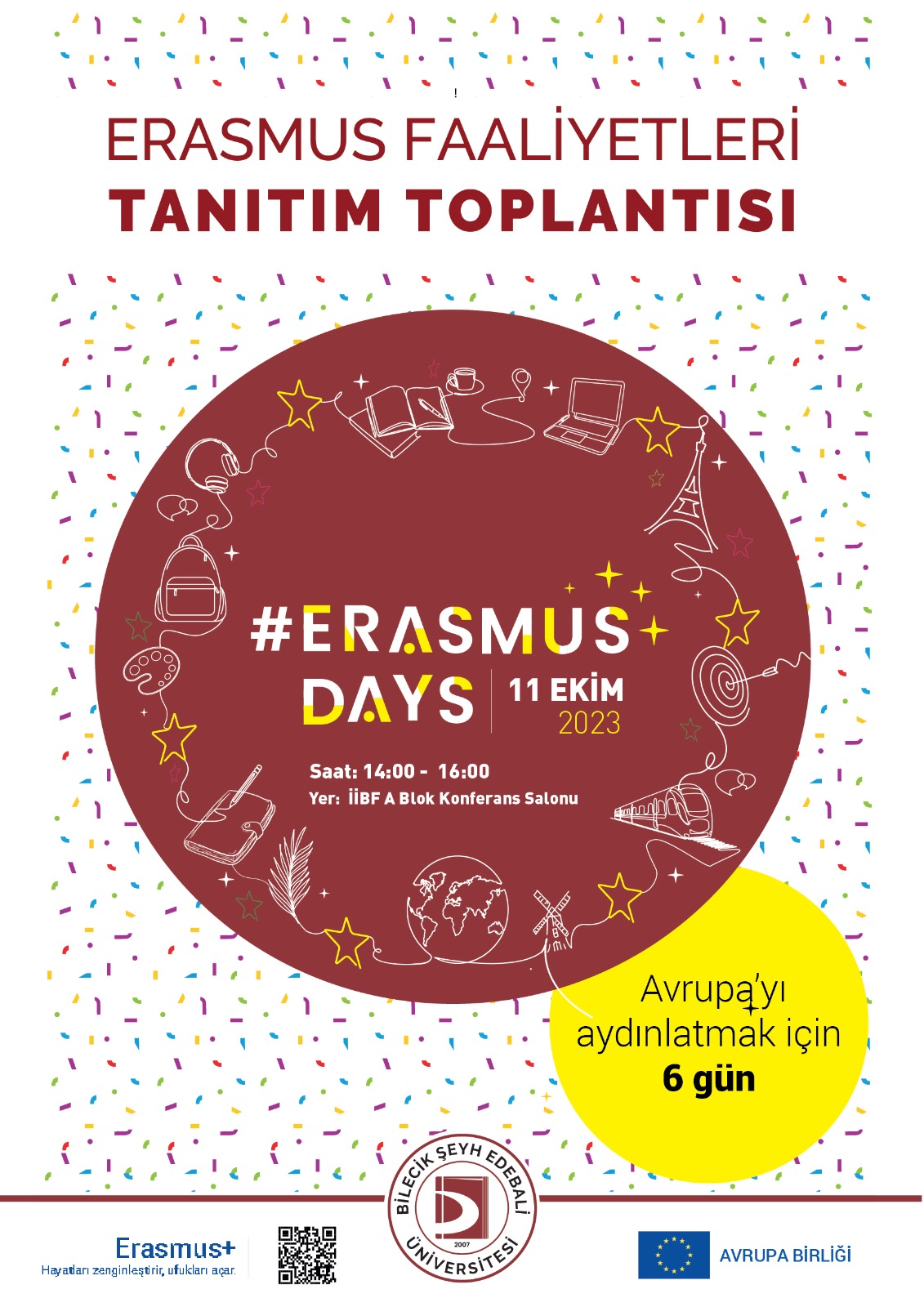 2023 Yılı Erasmus Günleri (#ErasmusDays) Faaliyetleri kapsamında Üniversitemiz Erasmus Koordinatörlüğü tarafından 'Erasmus+ Faaliyetleri Tanıtım Toplantısı' düzenlenmektedir. Etkinlik 11 Ekim 2023 tarihinde saat 14:00 ile 16:00 arasında İİBF A Blok Konferans Salonu'nda düzenlenecektir. Etkinliğe ait afiş için tıklayınız.
