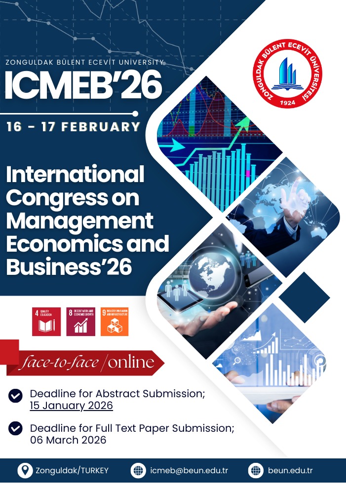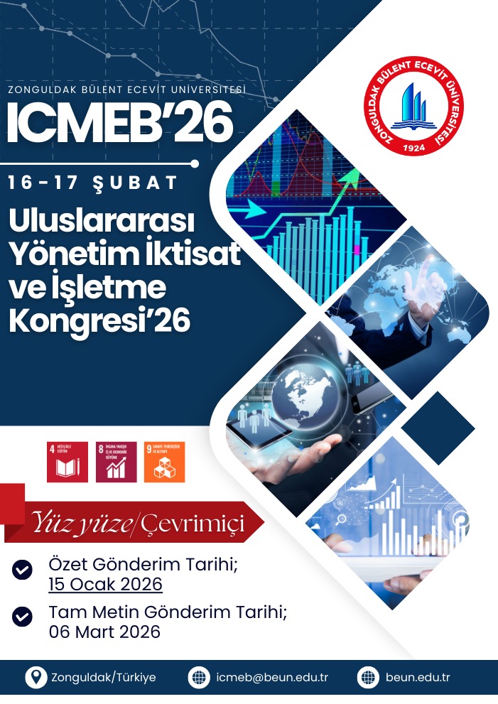 Zonguldak Bülent Ecevit Üniversitesi tarafından "Uluslararası Yönetim, İktisat ve İşletme Kongresi'26 (ICMEB'26)" 16-17 Şubat 2026 tarihlerinde gerçekleştirilecek olan sempozyuma ait afiş ektedir.