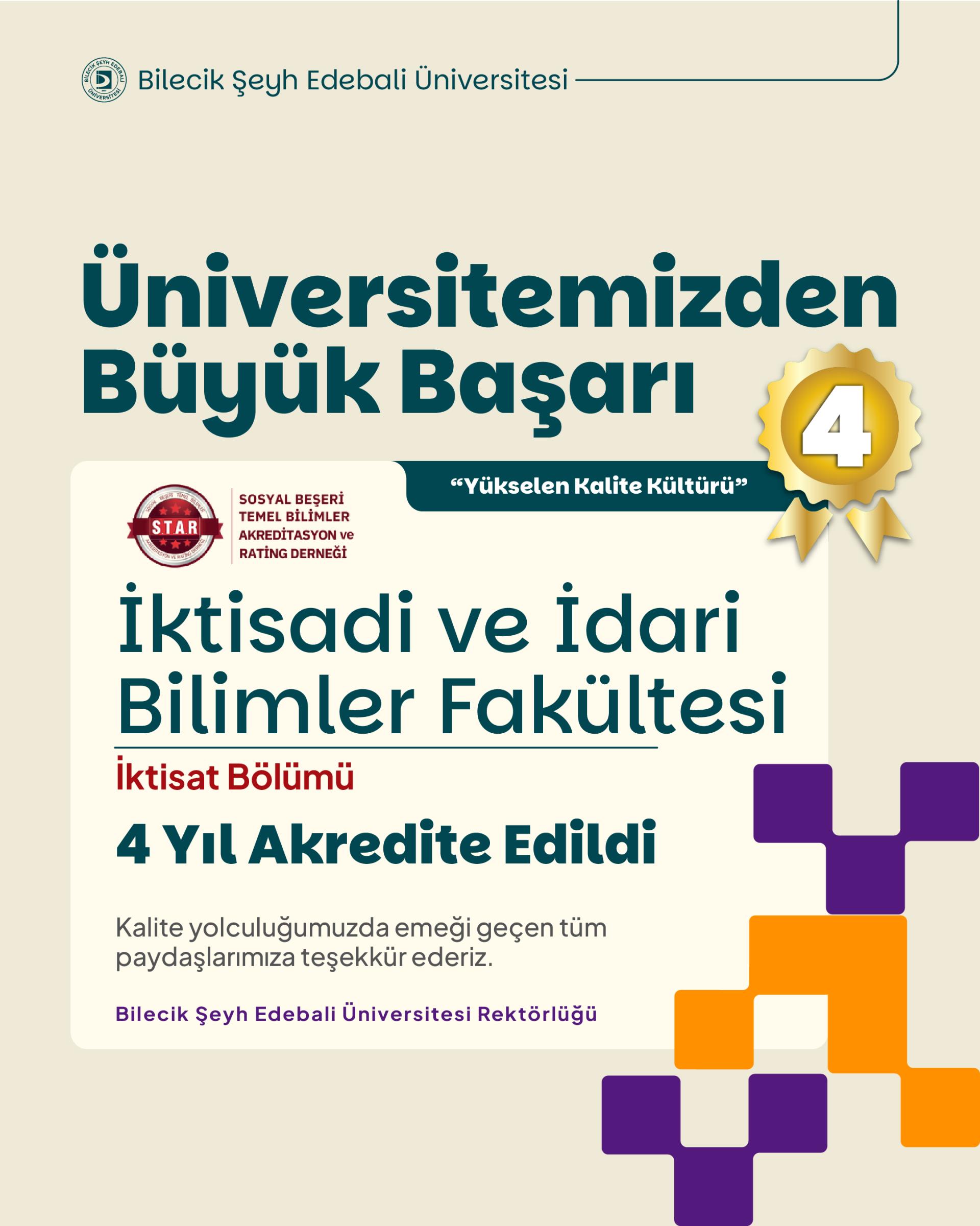Sosyal Beşerî ve Temel Bilimler Akreditasyon ve Rating Derneği (STAR) tarafından gerçekleştirilen kapsamlı değerlendirmeler neticesinde, İktisat Bölümü 4 yıl süreyle akredite edilerek önemli bir başarıya imza attı. Kalite odaklı eğitim anlayışımızın somut bir yansıması olarak öne çıkan akreditasyon, eğitim-öğretim faaliyetlerimizin niteliğini, akademik yeterliliğimiz ve kurumsal altyapımızı ulusal standartlar doğrultusunda tescillemektedir. Aynı zamanda öğrencilerimize sunulan eğitimin kalitesi, bağımsız bir değerlendirme süreciyle güvence altına alınmış olmaktadır. Kaliteyi kurumsal kültürünün temel unsurlarından biri olarak benimseyen bölümümüz, akreditasyon çalışmalarını sürdürülebilir akademik gelişimin önemli bir aracı olarak değerlendirmekteir.