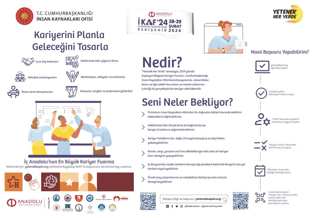 İç Anadolu Bölgesel Kariyer Fuarı (İKAF'24), 28-29 Şubat 2024 tarihlerinde "Yetenek Her Yerde" teması ile Cumhurbaşkanlığı İnsan Kaynakları Ofisi Başkanlığının koordinasyonunda üniversitemizin de aralarında bulunduğu 12 üniversitenin katılımı ile Anadolu Üniversitesi ev sahipliğinde gerçekleşecektir. Söz konusu kariyer fuarı ile ilgili katılım bilgilerine aşağıdaki broşürden ulaşabilirsiniz.