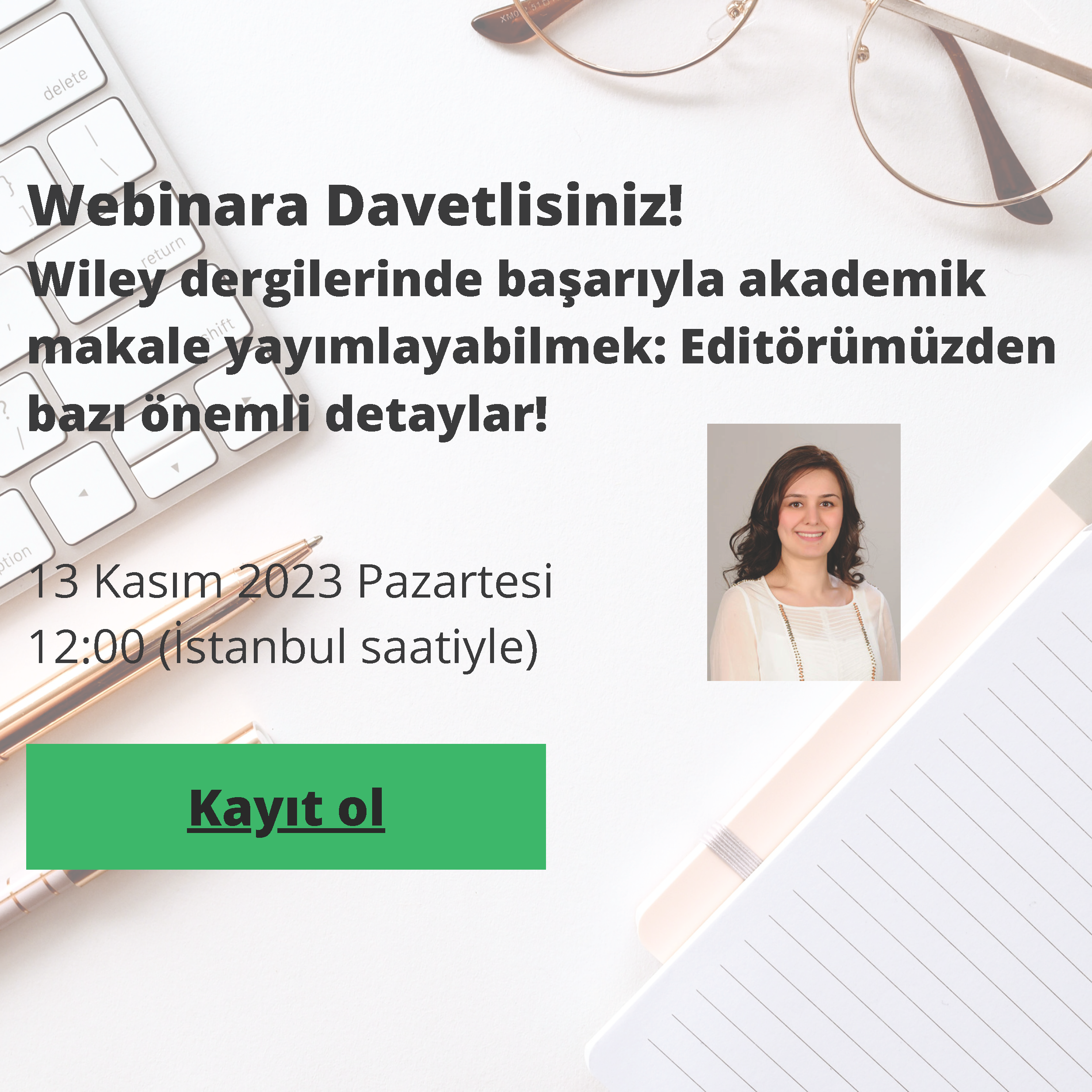 "Wiley dergilerinde başarıyla akademik makale yayımlayabilmek: Editörümüzden bazı önemli detaylar!" isimli webinar hakkındaki bilgiye aşağıdaki başlıklardan ulaşabilirsiniz. Kayıt linkinden kayıt yapılması gerekmektedir.