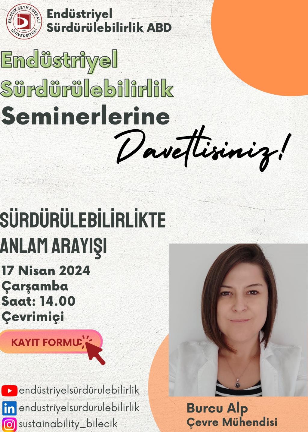 Burcu Alp'in konuşmacı olarak yer alacağı Sürdürülebilirlik Seminerlerinin bu haftaki konusu "Sürdürülebilirlikte Anlam Arayışı" olacaktır. 17 Nisan 2024 Çarşamba günü saat 14.00'te çevrim içi olarak gerçekleştirilecek seminere katılmak için linkte yer alan çevrim içi formu doldurunuz.