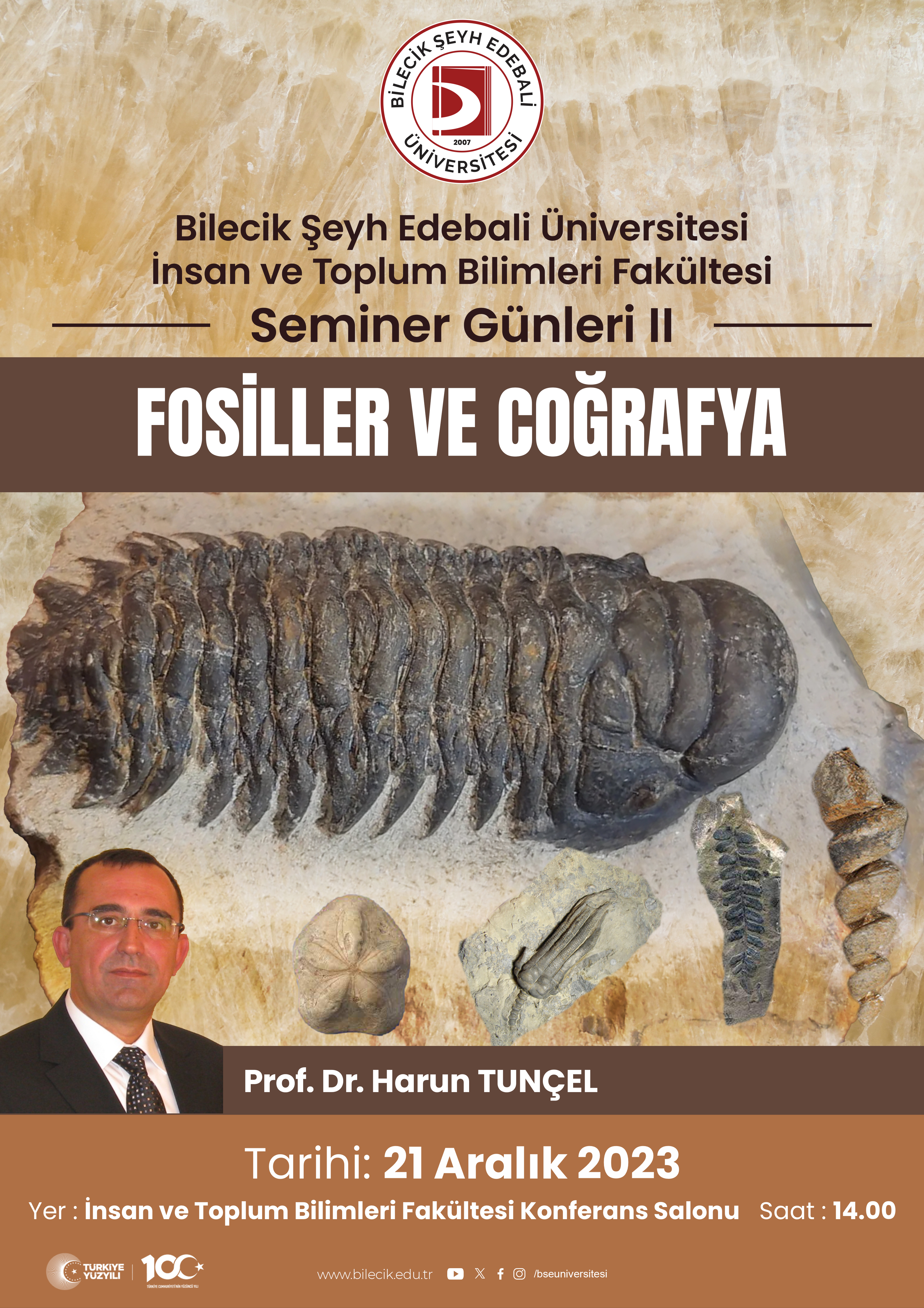 Üniversitemiz İnsan ve Toplum Bilimleri Fakültesi Konferans Salonunda 21 Aralık 2023 saat: 14.00' te Prof. Dr. Harun TUNÇEL tarafından ''Fosiller ve Coğrafya'' konulu seminer düzenlenecektir.