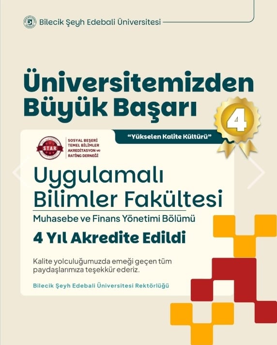 Bölümümüz Muhasebe ve Finans Yönetimi Bölümü STAR tarafından 4 yıl süre ile akredite edilmiştir. Emeği geçen tüm paydaşlarımıza teşekkür ederiz.