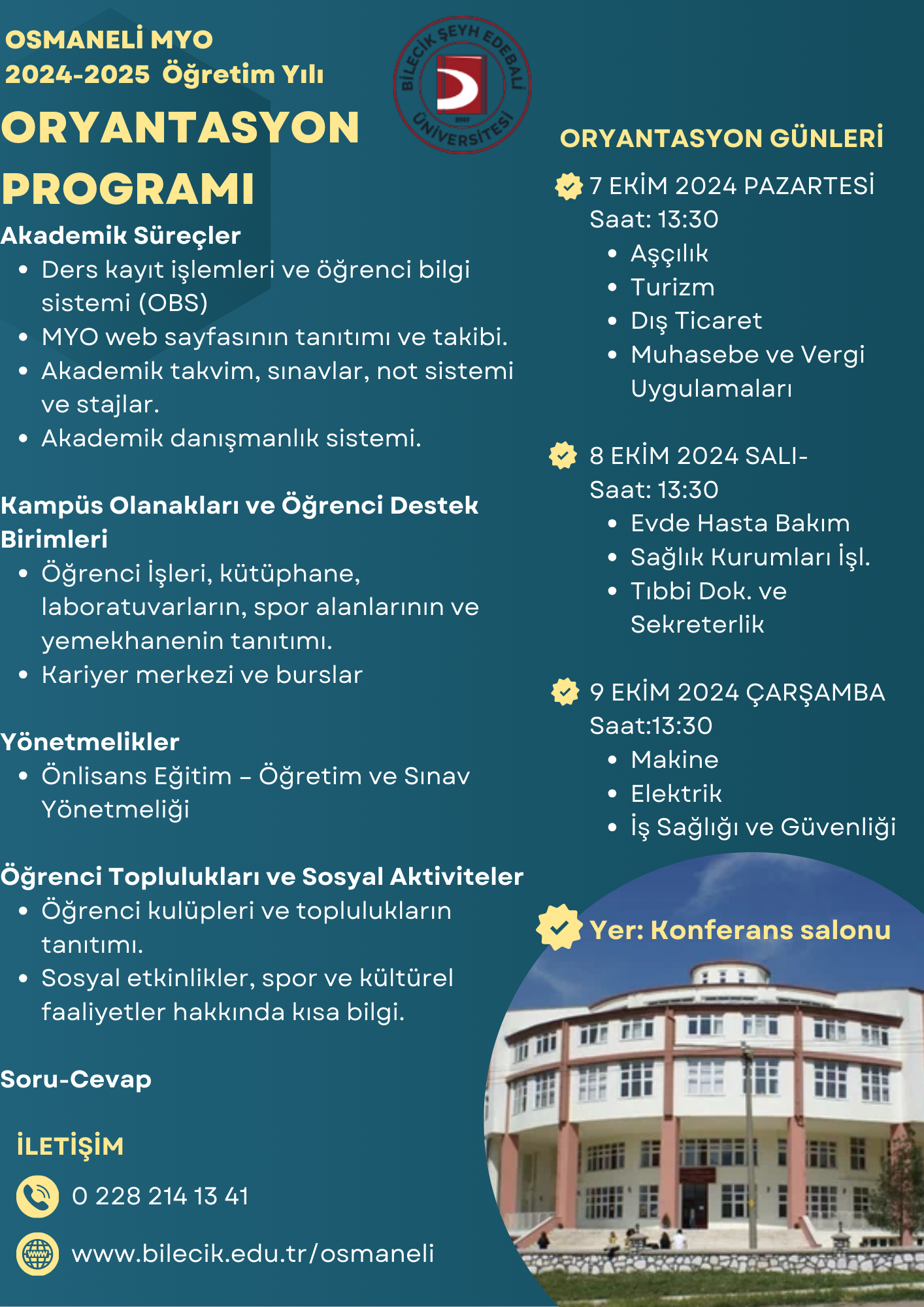 Osmaneli İSG Programamıza 2025 yılında ilk kaydını yaptıran İSG öğrencilerine 6 Ekim 2025 Pazartesi Saat 11:00 da D13 sınıfında oryantasyon eğitimi verilecektir. Yeni kayıt yaptıran öğrencilerin tamamının eğitime katılmak üzere hazır bulunmaları gerekmektedir. Daha önceki yıllarda kayıt yaptıran öğrenciler de eğitime katılabilir. Eğitimde başlıca