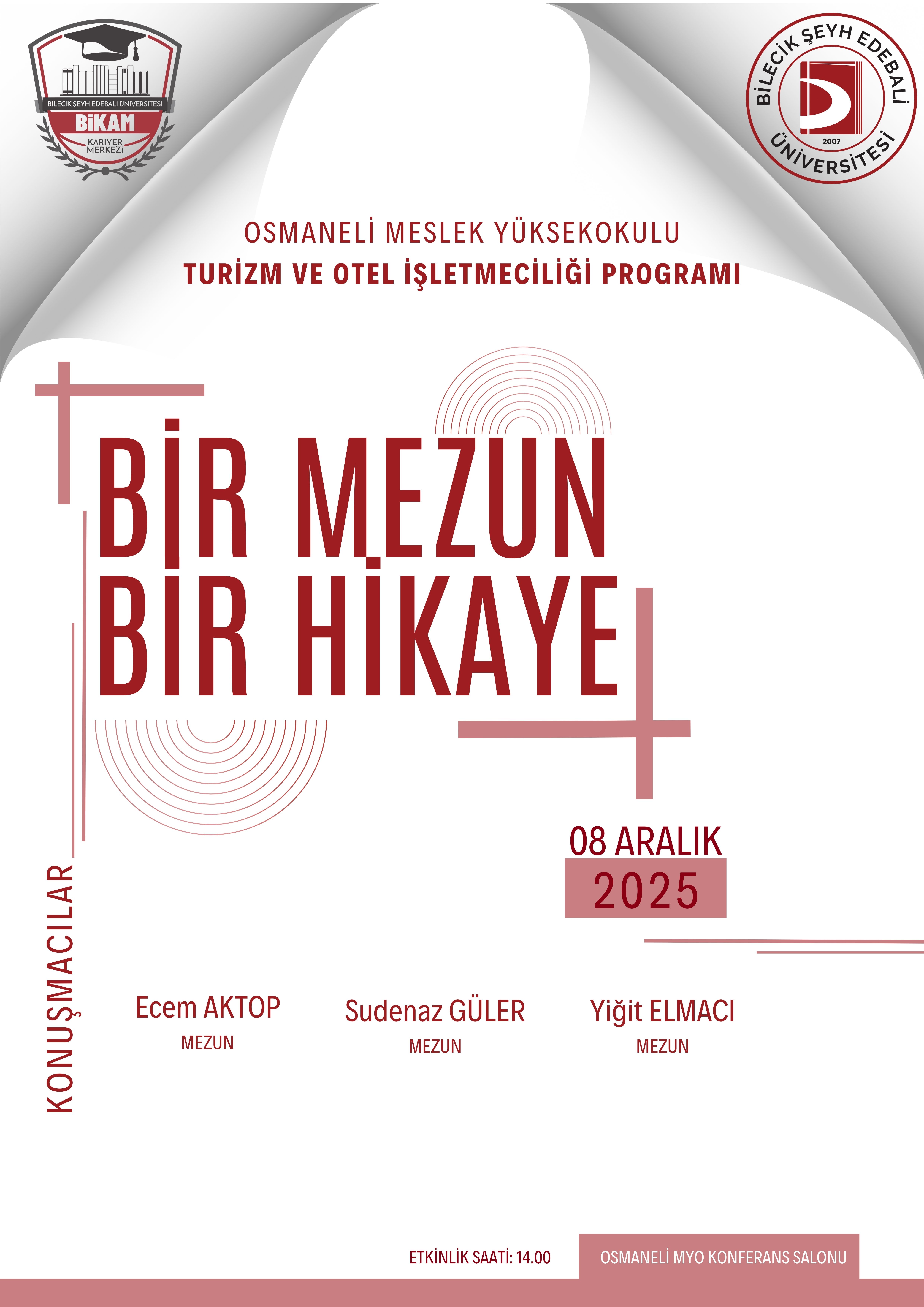 Osmaneli Meslek Yüksekokulu Turizm ve Otel İşletmeciliği Programı öğrencilerine yönelik düzenlenen “Bir Mezun Bir Hikâye” etkinliğine tüm öğrencilerimiz davetlidir.