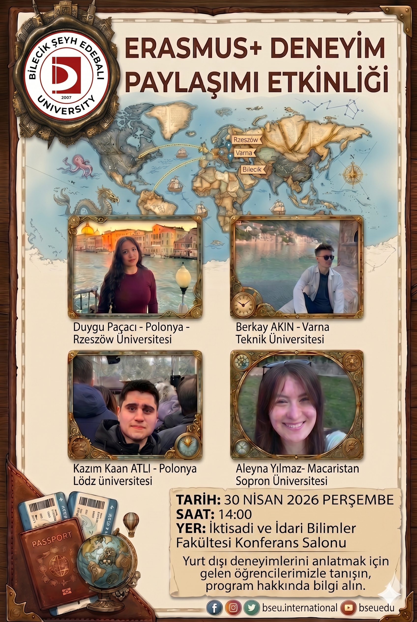 Konuşmacılarımız; başvuru sürecinin püf noktalarından derslere uyum sağlamaya, farklı kültürlerle tanışmaktan günlük yaşam deneyimlerine kadar merak ettiğiniz her detayı samimi bir şekilde paylaşacak. Bu etkinlik, Erasmus+ hayali kuranlar için yalnızca bilgilendirici değil, aynı zamanda motive edici ve ufuk açıcı bir buluşma olacak.